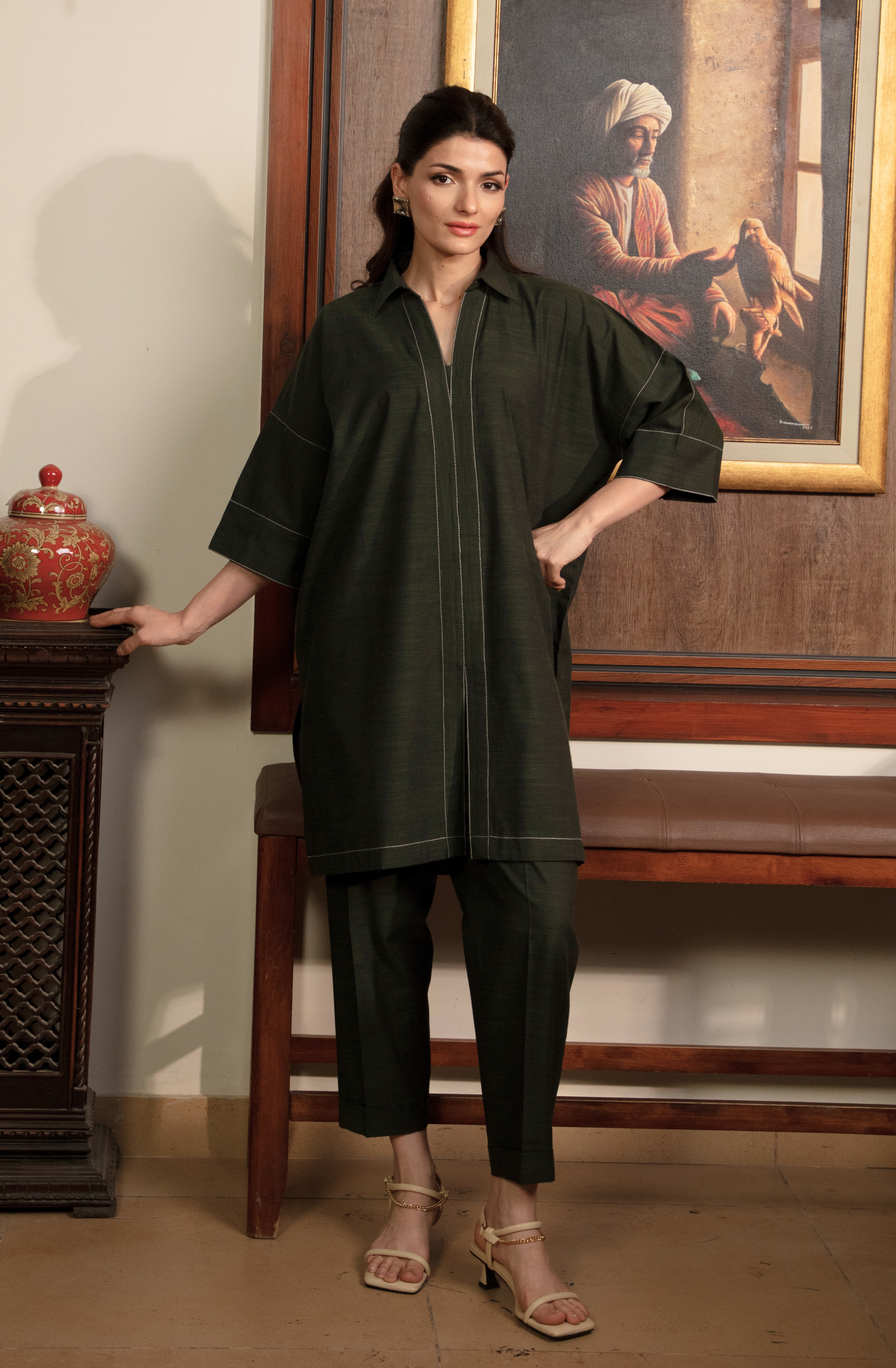 Rooted in calm strength, the Deep Green Cord Set is an ode to effortless sophistication. Crafted in a rich forest green chambray, the fabric offers a denim-like depth with the breathability of cotton—structured yet fluid, composed yet comfortable.