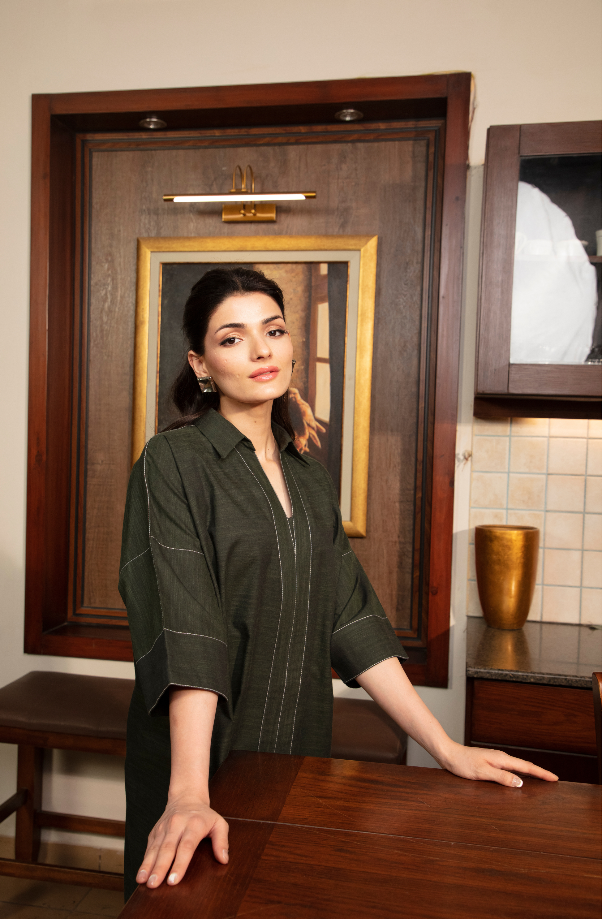 The relaxed V-neck top is detailed with subtle contrast stitching that defines the silhouette without overpowering it. Paired with straight-cut trousers, the look is clean, grounded, and quietly confident—designed for women who prefer understated authority over excess.