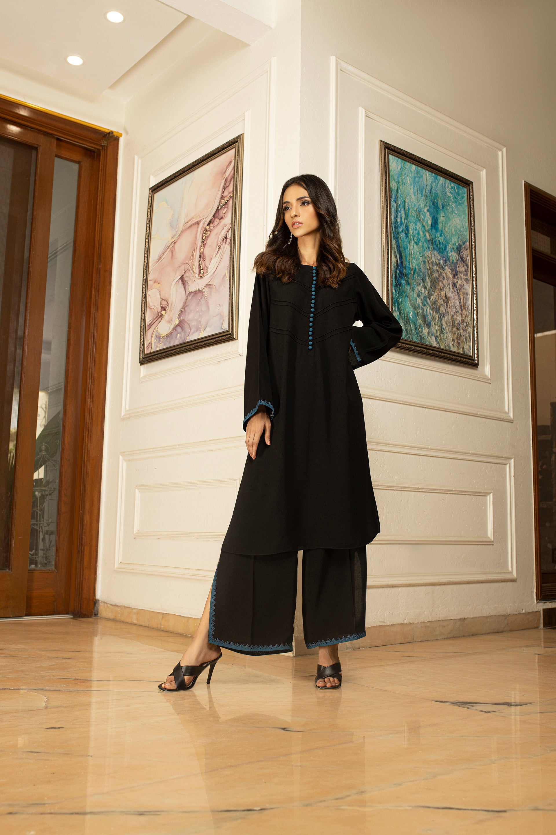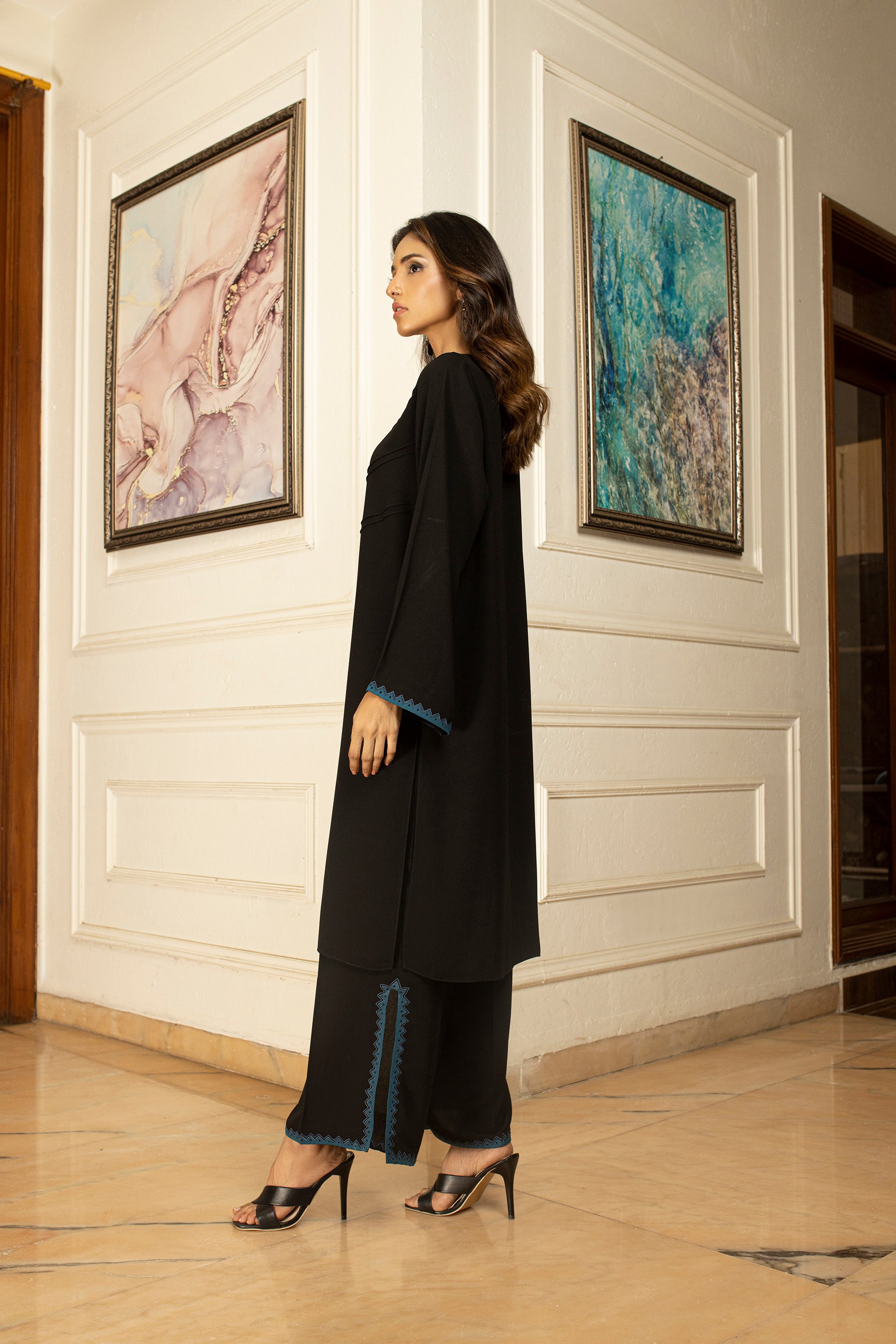 Elevate your wardrobe with this ensemble that blends contemporary design with artisanal craftsmanship. Step confidently into any event, radiating poise and allure with the fusion of black and blue, and the delicate embroidery that speaks volumes of your refined taste.