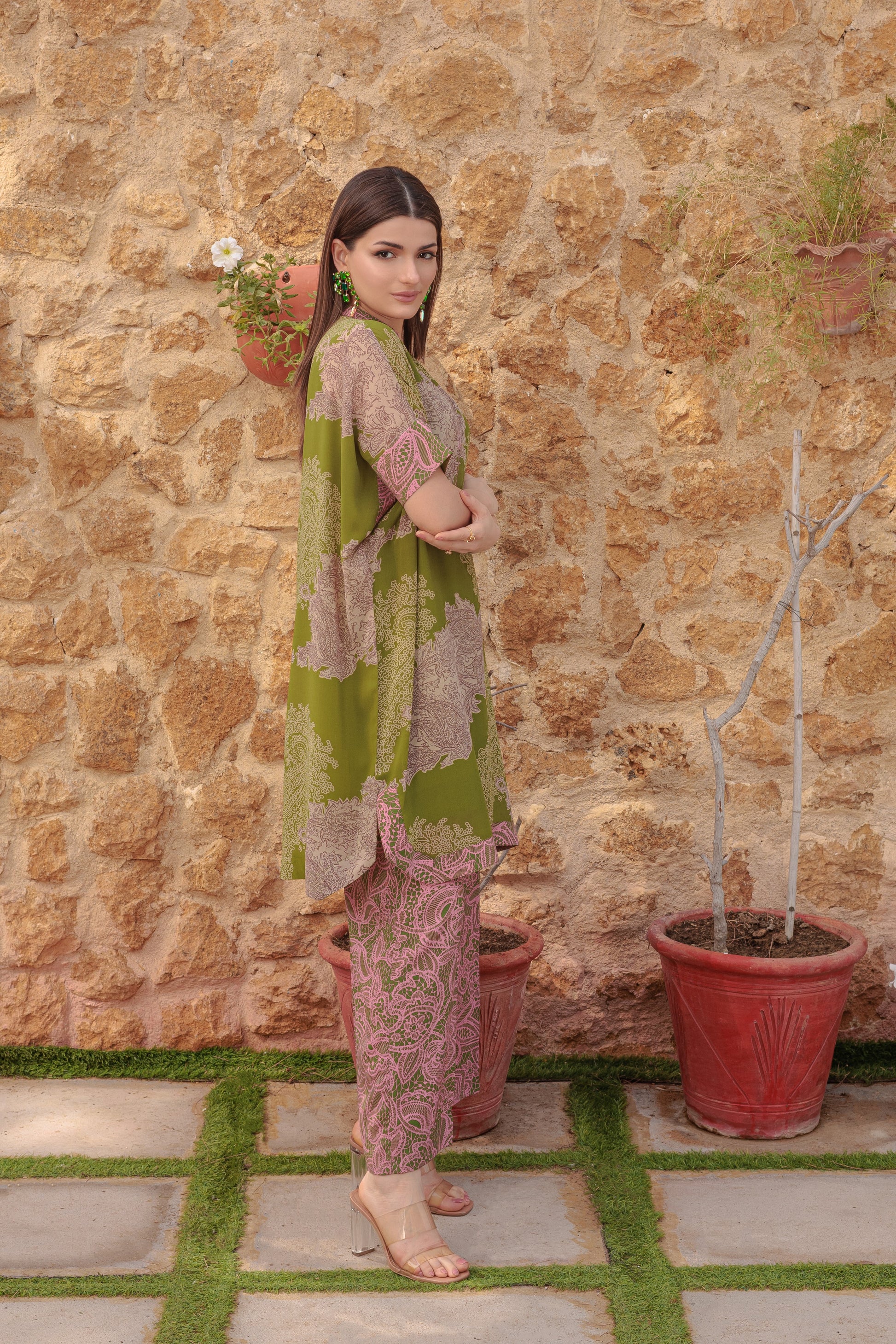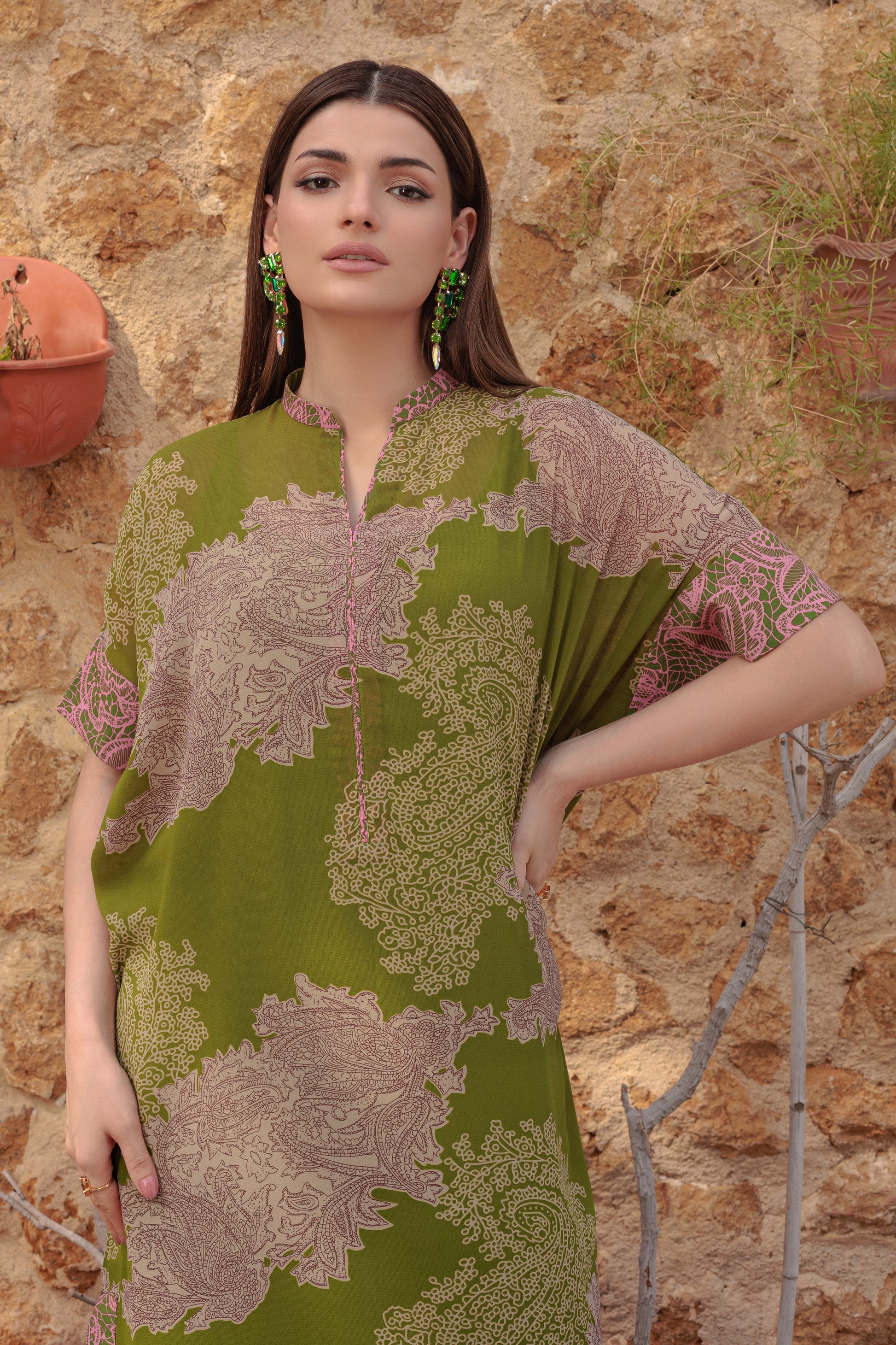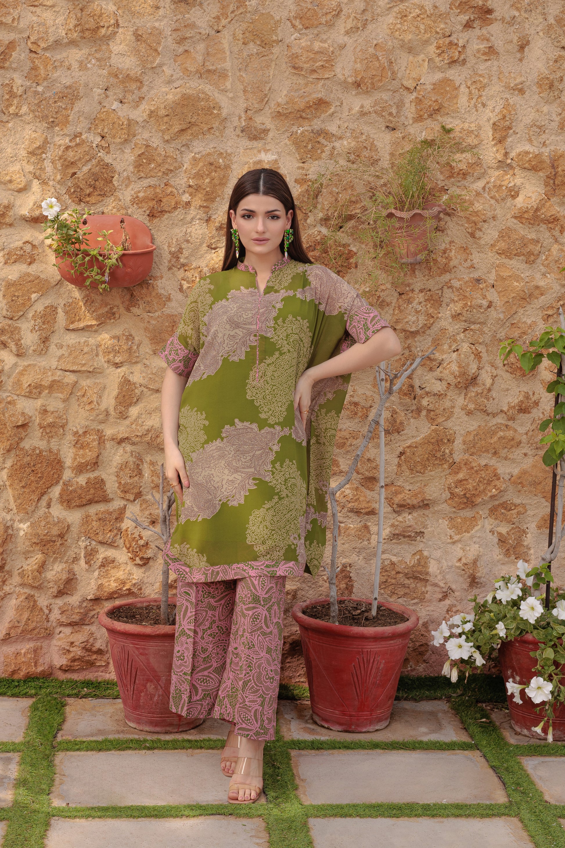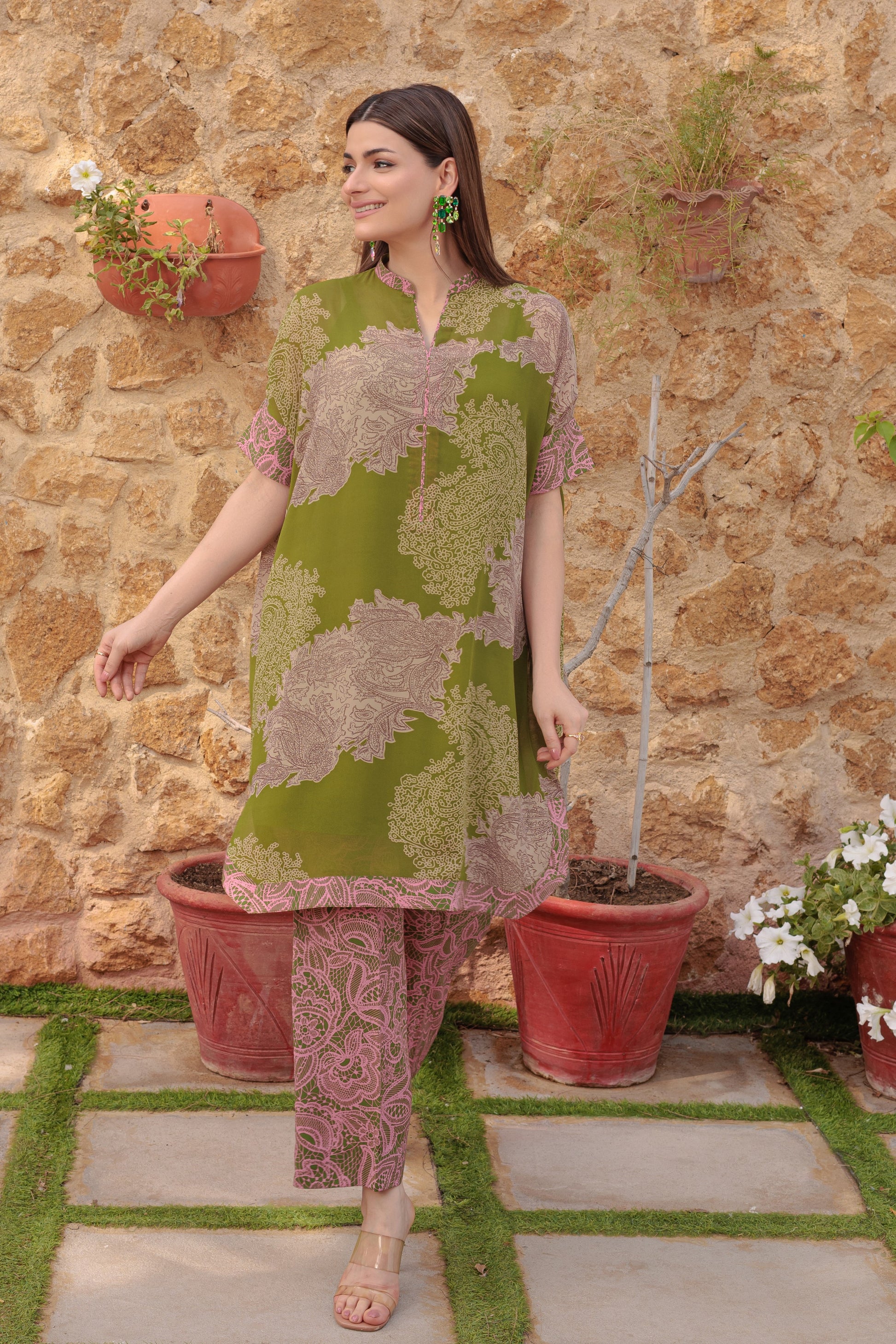 Embrace timeless elegance with this refreshing floral green ensemble, designed to exude grace and sophistication. The pure soft chiffon top is beautifully accented with contrasting applique details on the band collar, hemline, and sleeves, adding a touch of intricate craftsmanship. Paired with expertly tailored pure crepe trousers, this ensemble strikes the perfect balance between refined luxury and effortless charm.