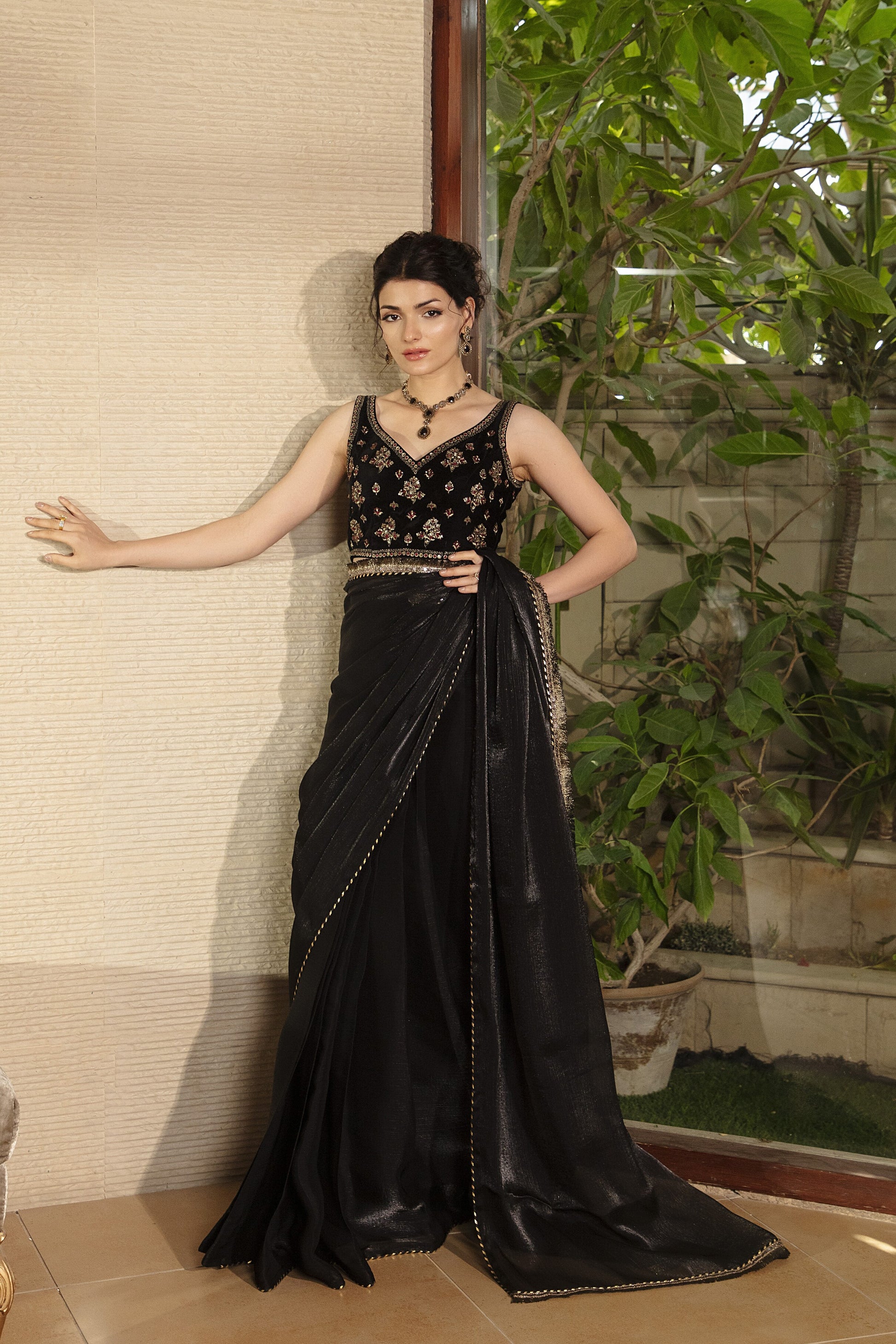 A celebration of elegance in its most powerful form - Noir Radiance blends the depth of black with a luminous, sheer drape that moves like liquid midnight. The saree catches the light in soft glints, creating a quiet yet captivating shine. Paired with a velvet blouse adorned in intricate hand-embroidered motifs, this piece feels regal, modern, and effortlessly commanding.