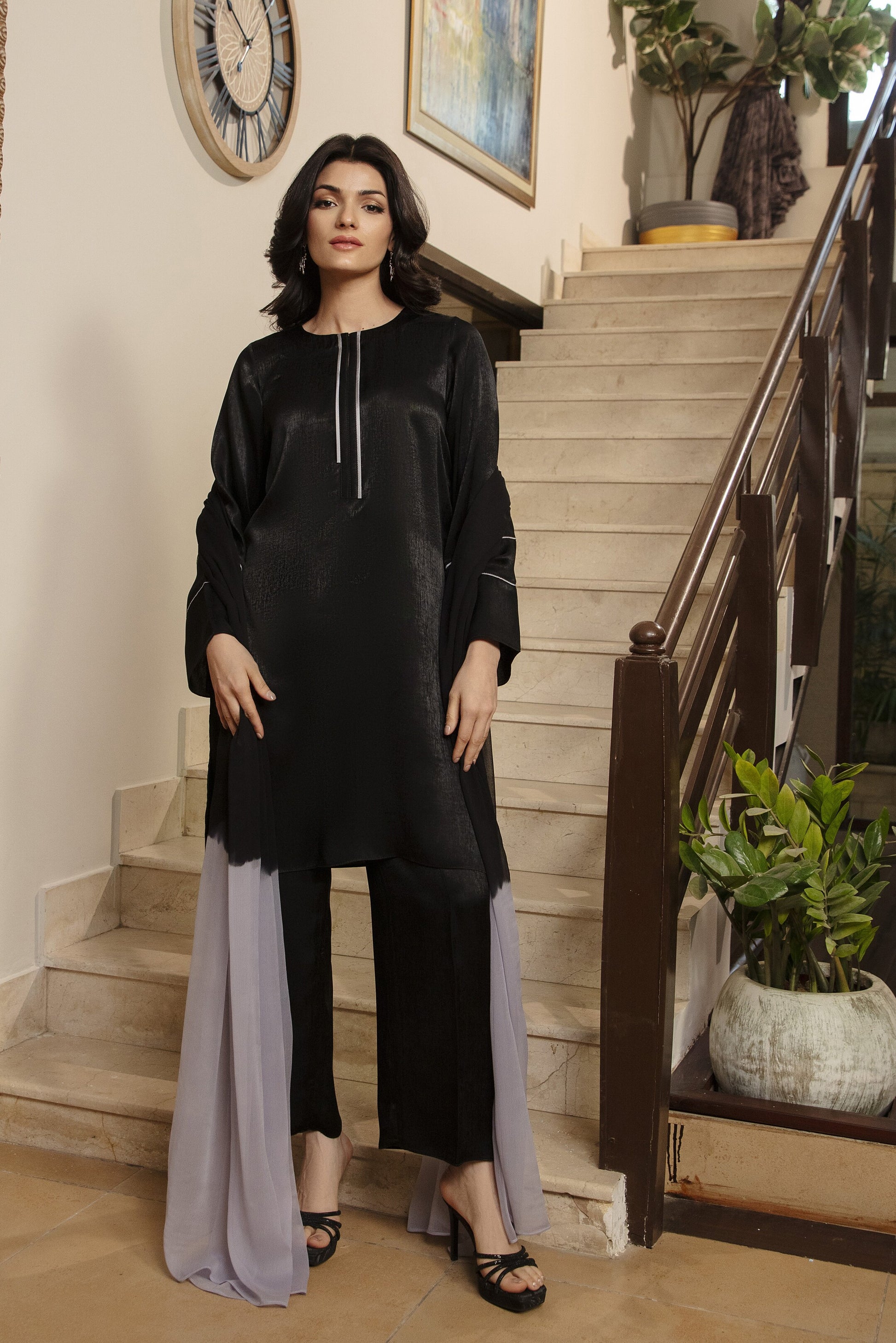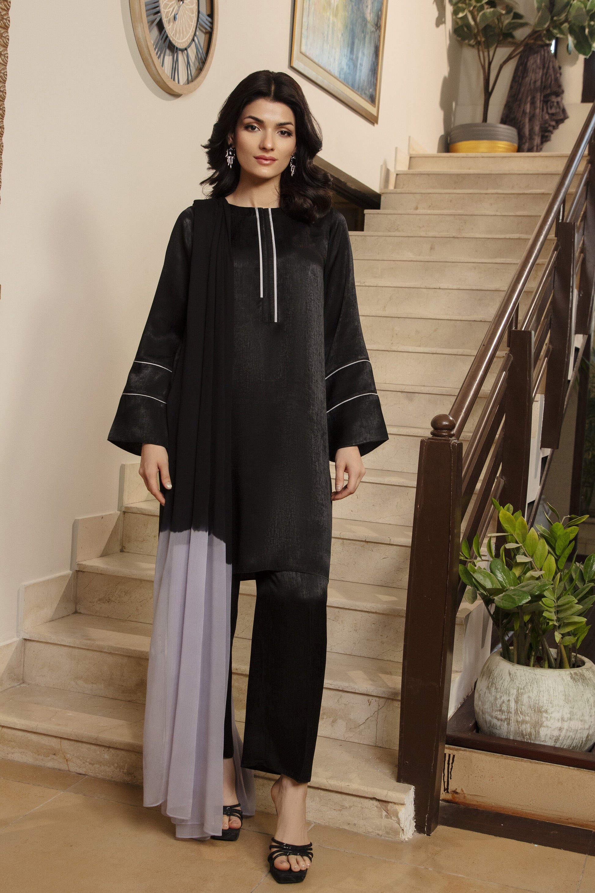 The Noir Silk Cord Set is where effortless sophistication meets everyday ease. Crafted in a textured silk blend, the shirt carries a soft sheen that elevates even the simplest silhouette. Minimal linear detailing adds refinement, while the structured trousers create a clean, elongated form. Finished with a flowy chiffon dupatta in a dual-tone contrast, this set becomes a wardrobe staple that feels polished without trying.