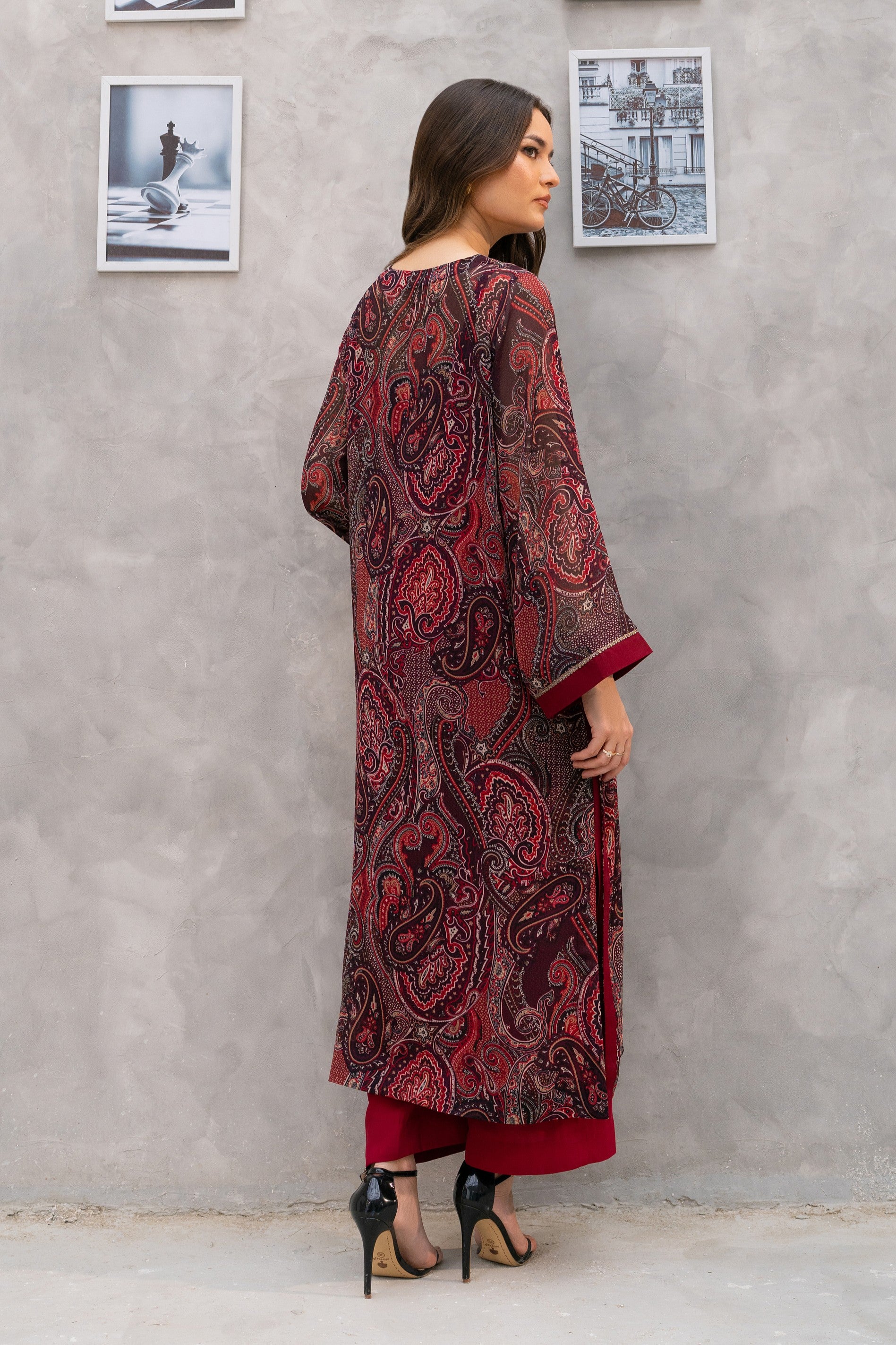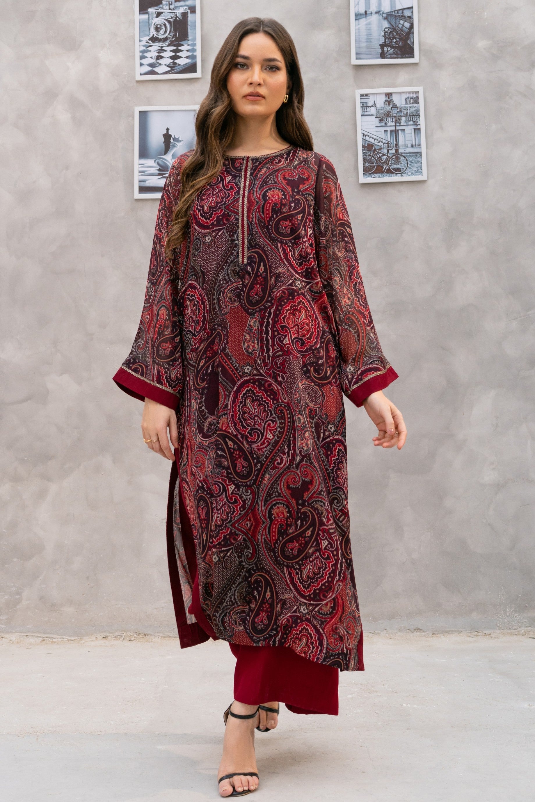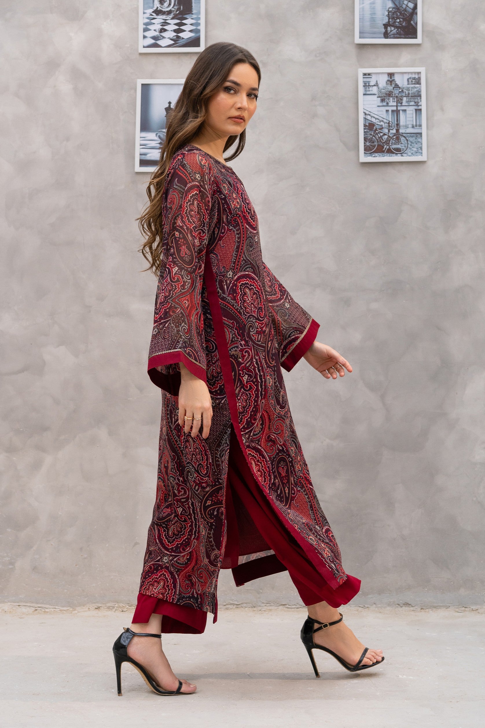 Infused with the richness of maroon and depth of intricate paisley, the Rouge Rumi Set is a celebration of timeless print and regal tones. The A-line chiffon shirt flows with grace while delicate threadwork along the neckline and sleeve cuffs adds finesse. Side panels and borders in solid maroon crepe break the print elegantly, giving the outfit a well-defined structure.
