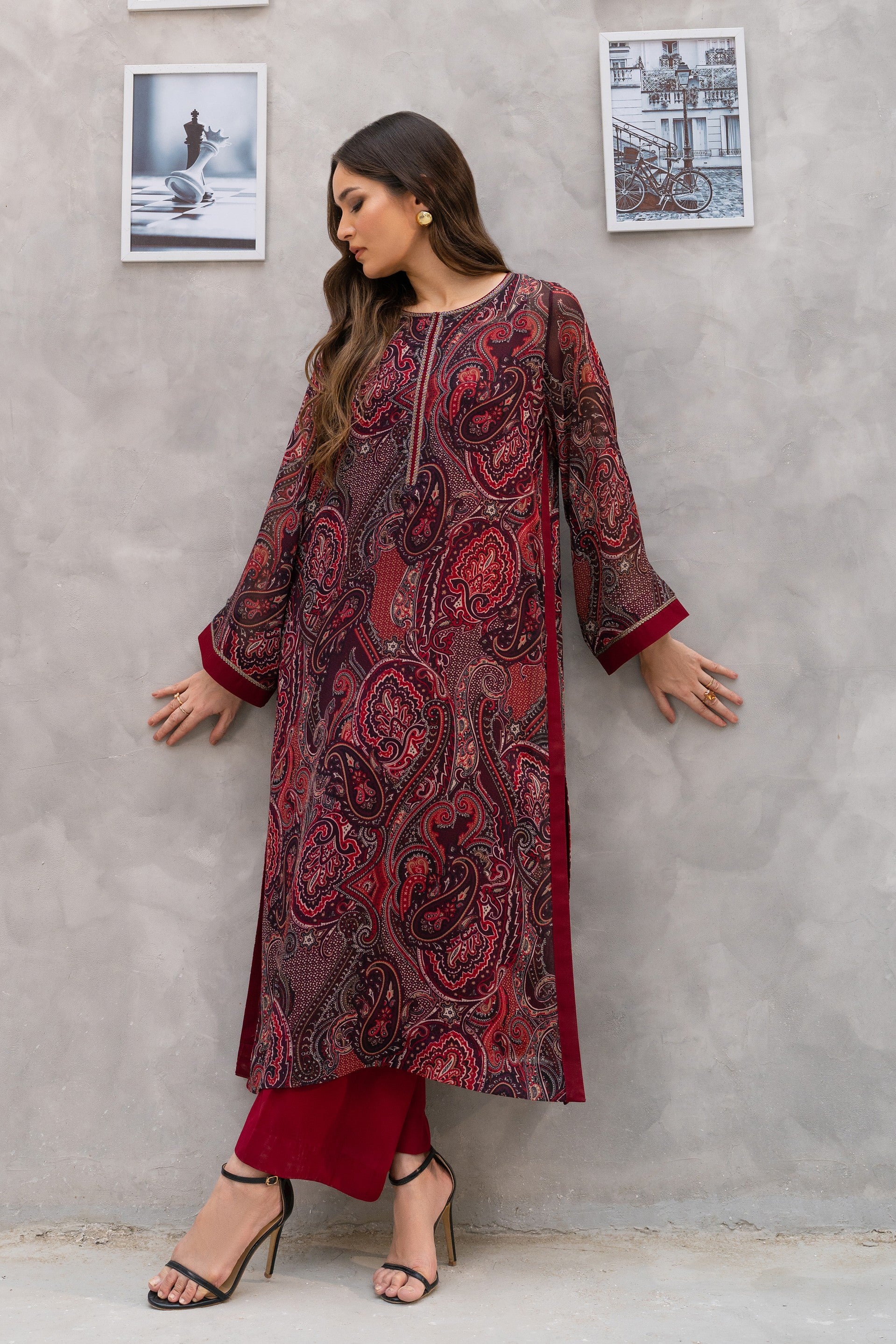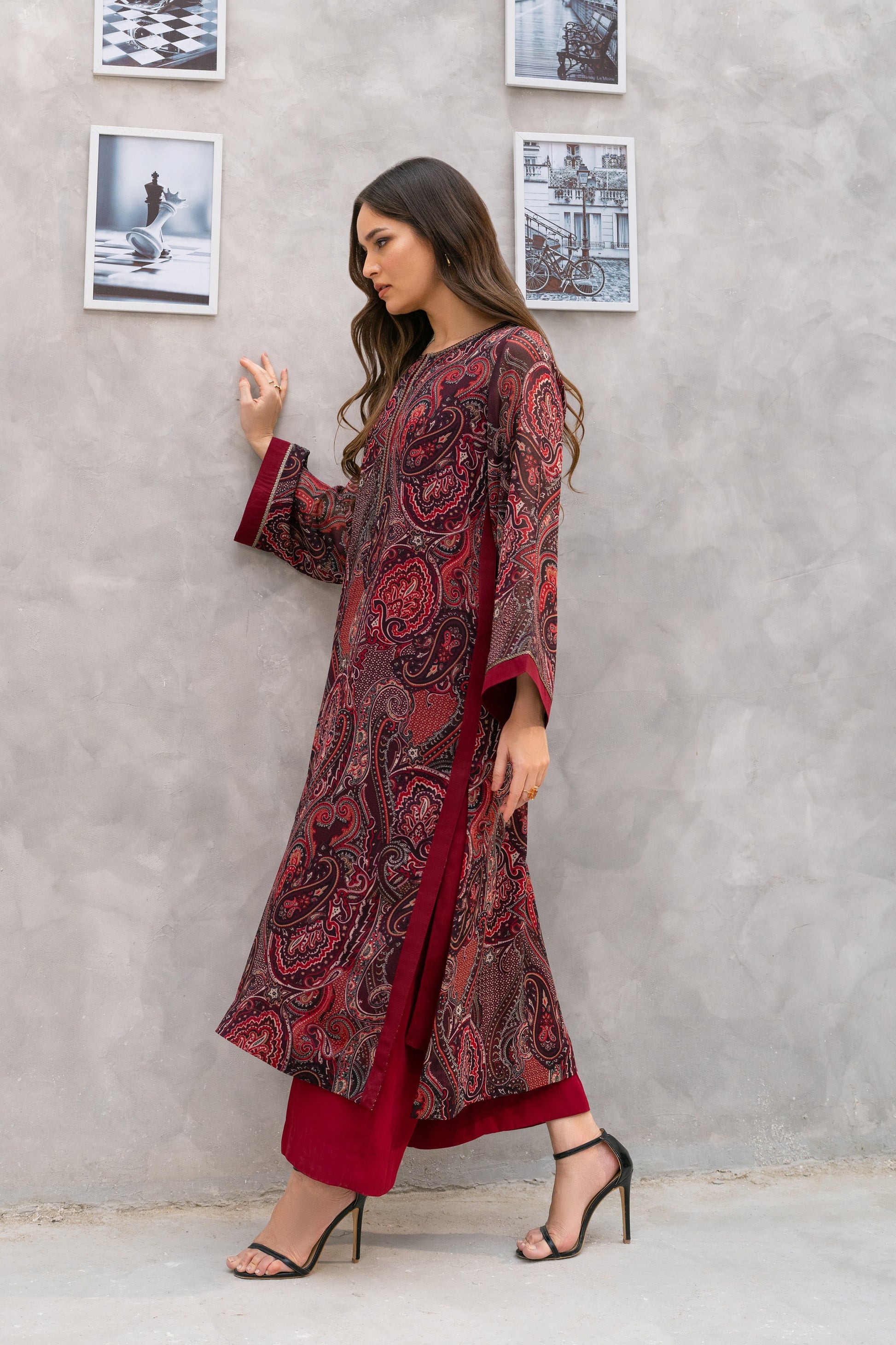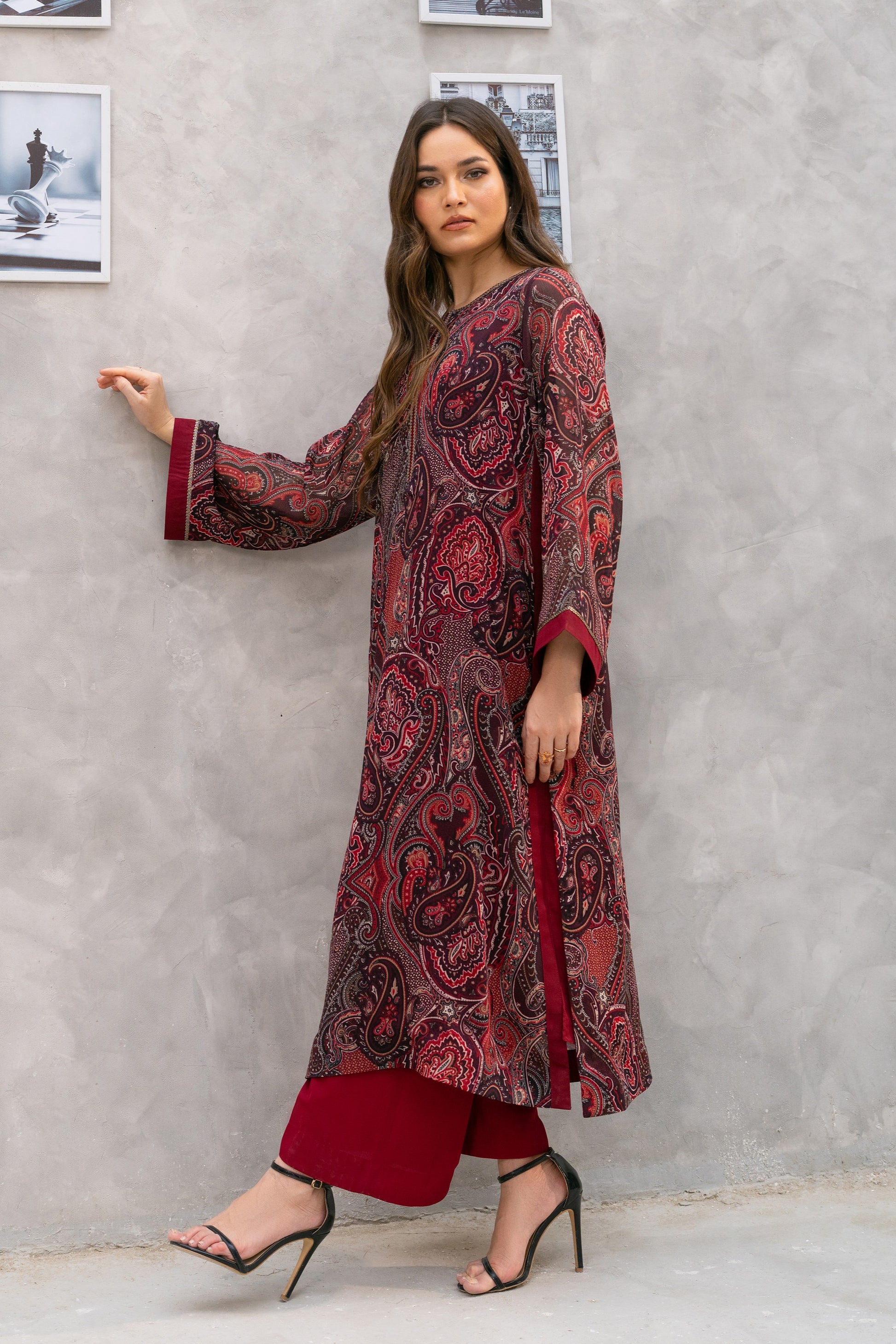 Infused with the richness of maroon and depth of intricate paisley, the Rouge Rumi Set is a celebration of timeless print and regal tones. The A-line chiffon shirt flows with grace while delicate threadwork along the neckline and sleeve cuffs adds finesse. Side panels and borders in solid maroon crepe break the print elegantly, giving the outfit a well-defined structure.