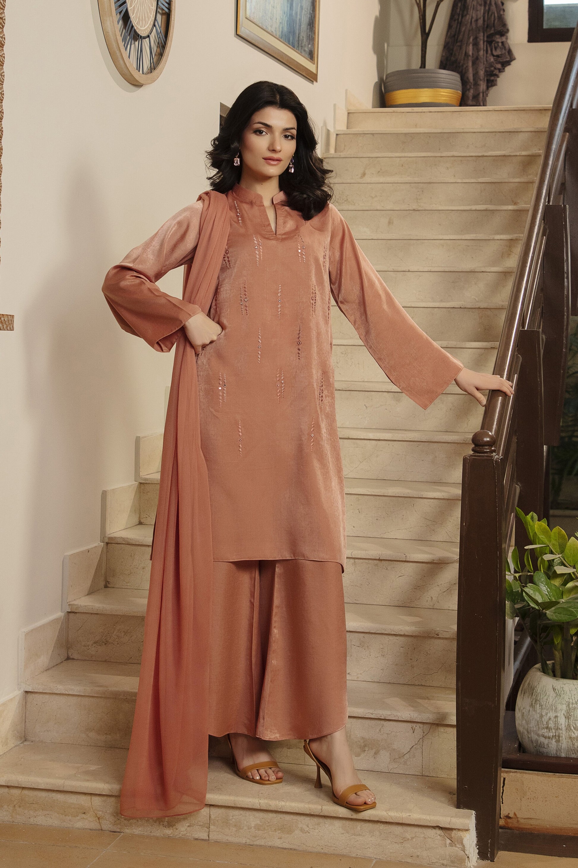 Pair with nude heels, peach-toned makeup, and soft curls for a cohesive salmon glow that feels both luxurious and effortlessly wearable.