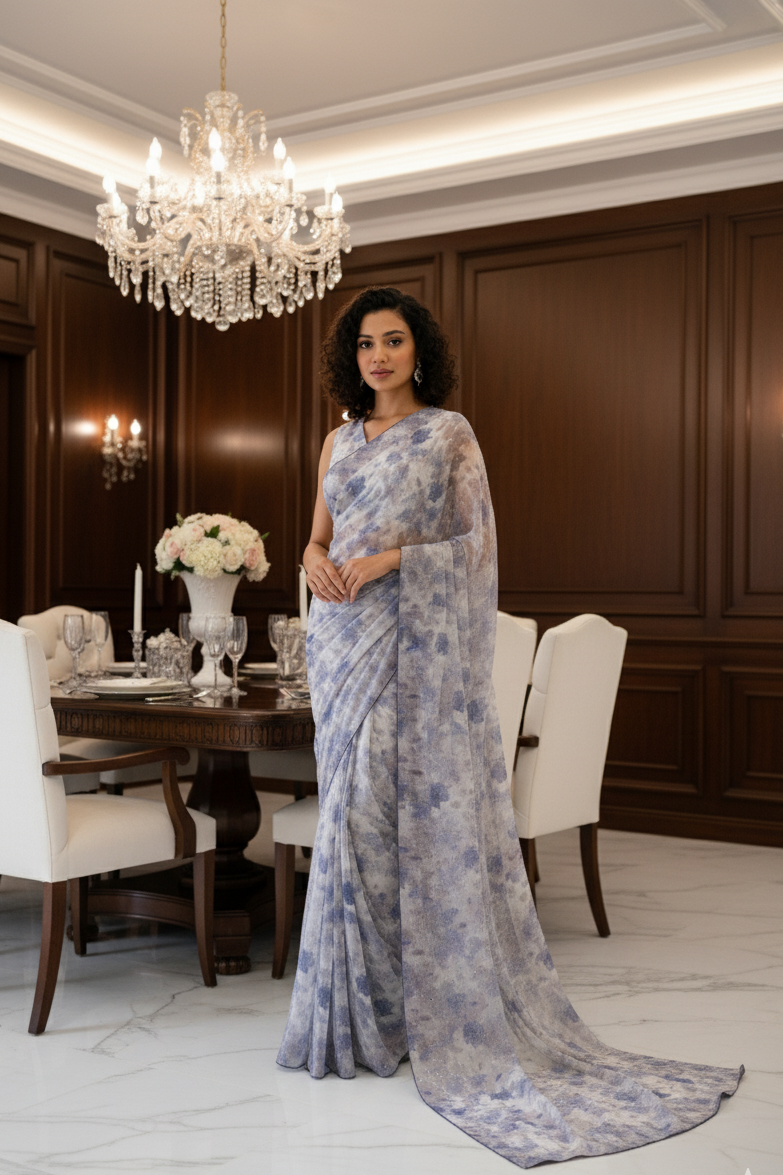 A mist of florals caught in motion — the Silver Bloom Saree captures a quiet kind of elegance, designed for women who exude presence without saying a word. Tailored from airy chiffon in watercolor lilac tones, the saree features delicate floral blot prints and subtle glimmers. Paired with a sleeveless blouse featuring self-button details and pearl-edged sleeves, this ensemble flows like poetry with every step.