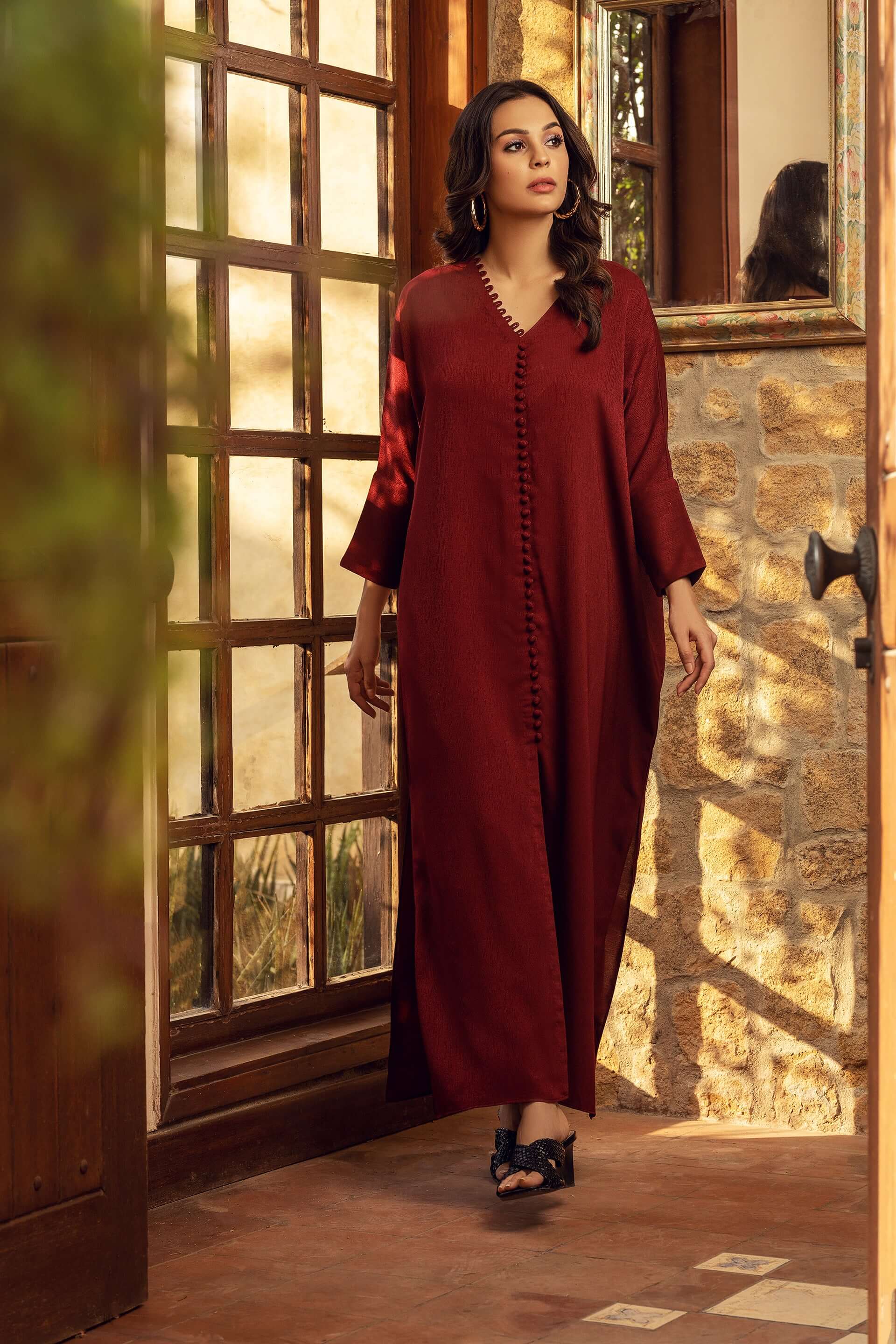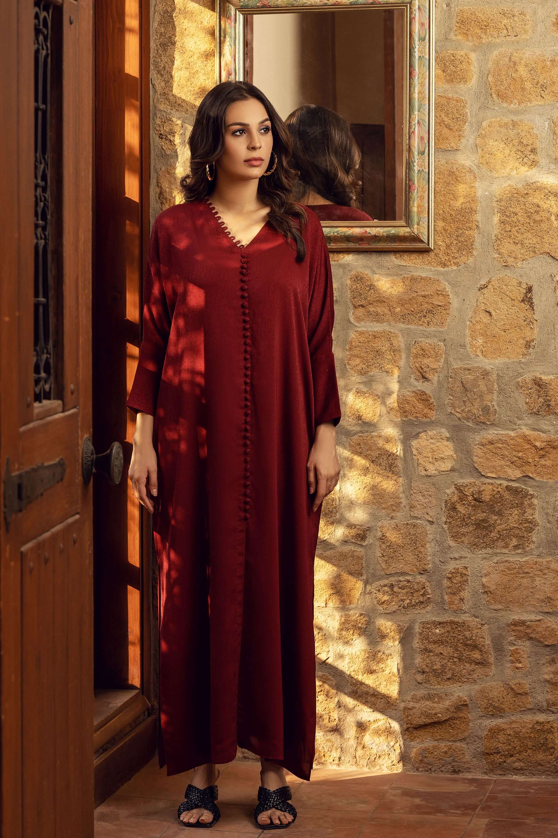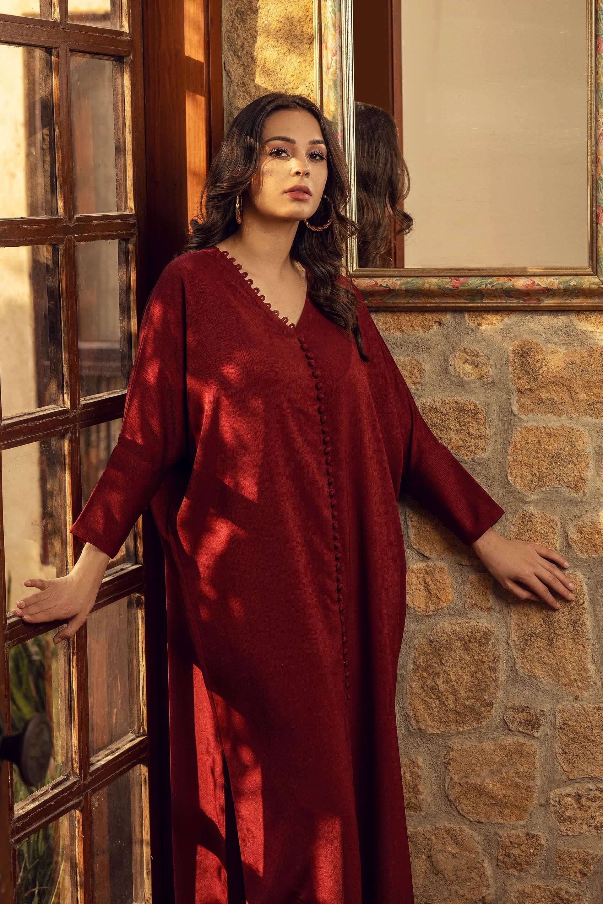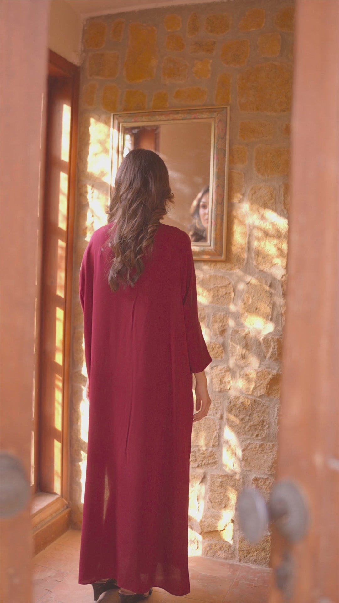 A deep crimson hue finds its form in the Rosewood Co-ord Set — a composed yet effortless silhouette crafted in breathable textured crepe. The long shirt features a V neckline and an extended row of self-fabric buttons, giving it a rhythmic charm. Flared sleeves and side slits add ease to movement, while the coordinating pants maintain a clean, unfussy profile — designed to flatter every shape with grace and intention.